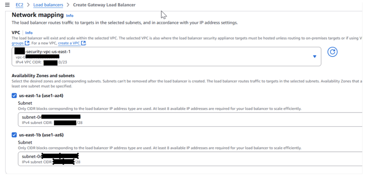 - Deploy your third-party firewalls behind a Gateway Load Balancer. When you create the GWLB note that you will define your network mapping for the loadbalancer and associate AZ’s and subnets.