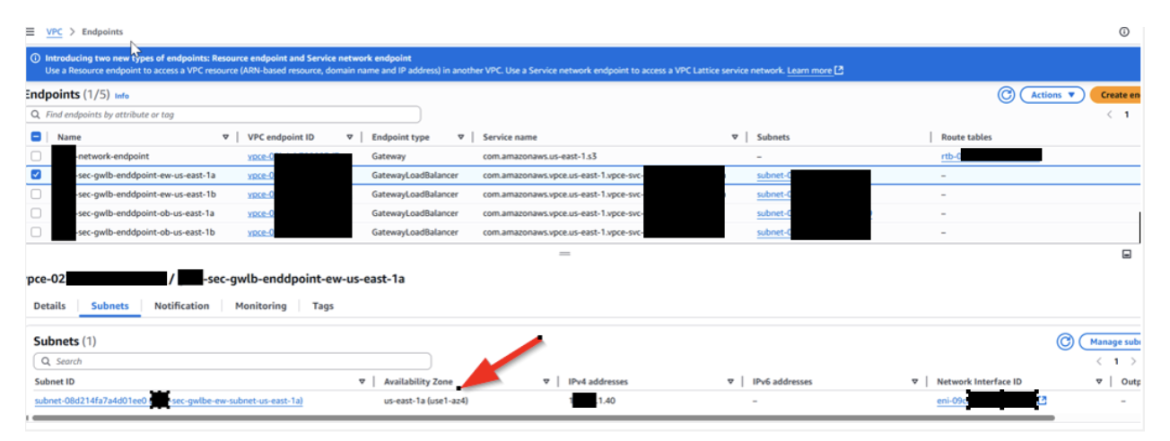 - Ensure GWLBE is available in your target AWS Region. This can be checked via the aws cli using the following command “describe-vpc-endpoint-services”https://docs.aws.amazon.com/vpc/latest/privatelink/gateway-load-balancer-endpoints.html#prerequisites-gateway-load-balancer-endpoints , additionally you can read more about availability zones and their logical id’s here https://docs.aws.amazon.com/ram/latest/userguide/working-with-az-ids.html#:~:text=AWS%20maps%20the%20physical%20Availability,%22a%22%20for%20each%20Region