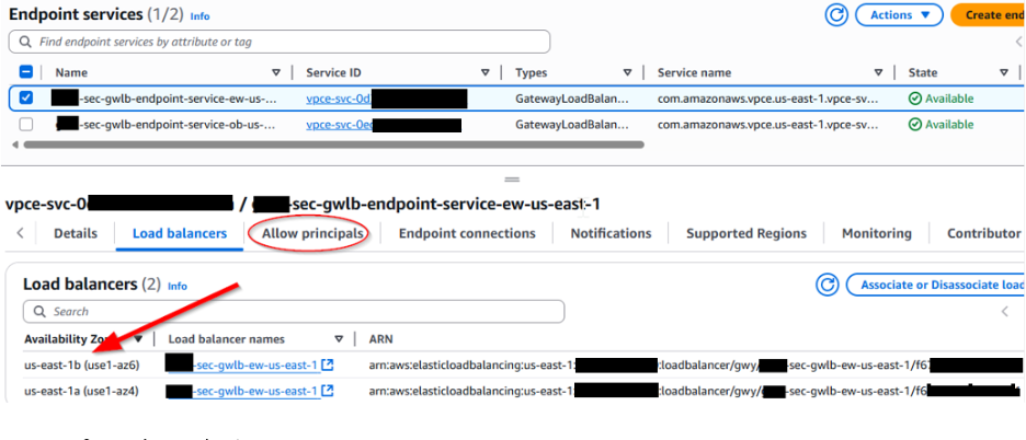 - Register a GWLB Endpoint Service targeting your GWLB load balancer. Note here the AZ name and physical AZ location ID are different. Also highlighted here is the ‘Allow Principles’ tab used in the next step.