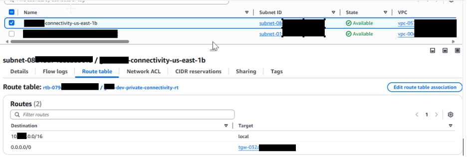 Here you can see the connectivity subnet for which the GLBE resides. This route table has a simple route utilizing the transit gateway.