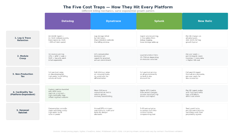 Here’s what most vendor-comparison blogs won’t tell you: every major commercial observability platform has pricing mechanics that spiral under the same conditions. The billing units differ, but the outcome is identical—costs that outpace infrastructure growth.