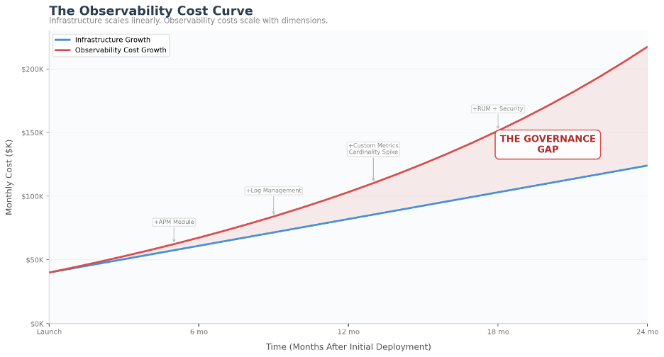A VP of Engineering pulls up the annual cloud spend review. Infrastructure costs are trending where Finance expected—up a bit, but manageable. Then they look at observability. The Datadog line item was $80,000 a month eighteen months ago. Today it’s $180,000. There was no single decision to double the spend. No one approved it. It just grew—quietly, steadily, month over month—as teams added modules, onboarded new services, and nobody questioned whether dev environments needed the same telemetry depth as production.