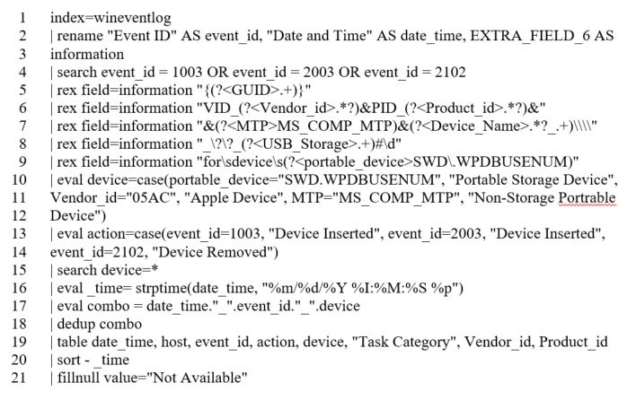 In reviewing the events, we concluded Event ID’s 1003, 2003, and 2102 provided the best group of events to identify when a device is inserted and removed, without being overly verbose. If Event Filtering is available prior to being ingested into Splunk, these events would be the most valuable. From what we have seen, 1003 seems to capture USB Removable Drives, but will not capture mobile devices. In addition, 2003 seems to capture MTP devices.